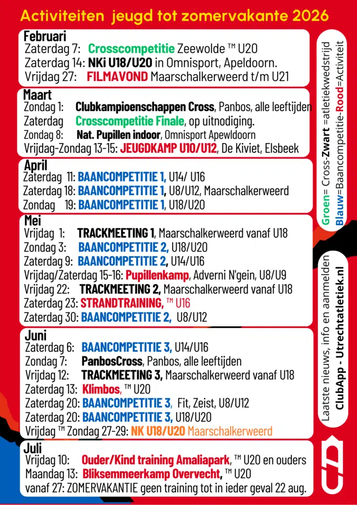 Jeugdatleten zijn verplicht om vier van de zes wedstrijden deel te nemen. Verder zijn er twee onderlinge wedstrijden binnen de club. De clubkampioenschappen indoor en de clubkampioenschappen outdoor. Deze vallen op de eerste zaterdag van januari en de laatste zondag van september.