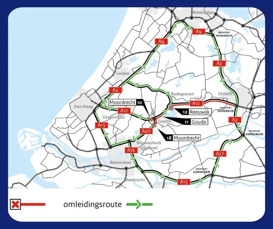 - A12 en A20 dicht van Moordrecht tot knooppunt Oudenrijn (Den Haag richting Utrecht).