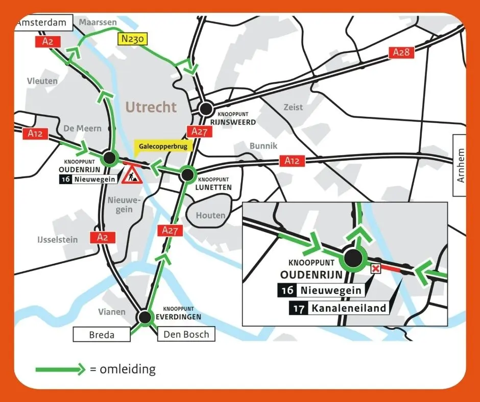 - Bij Utrecht rijdt het verkeer om via de N230 (Noordelijke Randweg Utrecht) en de A27 óf de A2 en A27 (zie ook de omleidingskaart).