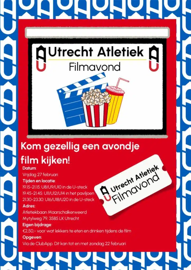 Op vrijdag 27 februari organiseren we een gezellige filmavond voor alle jeugdgroepen van Utrecht Atletiek! We draaien drie filmrondes, ingedeeld op leeftijd. Zo zorgen we voor een passende film en geschikte tijden voor iedereen.