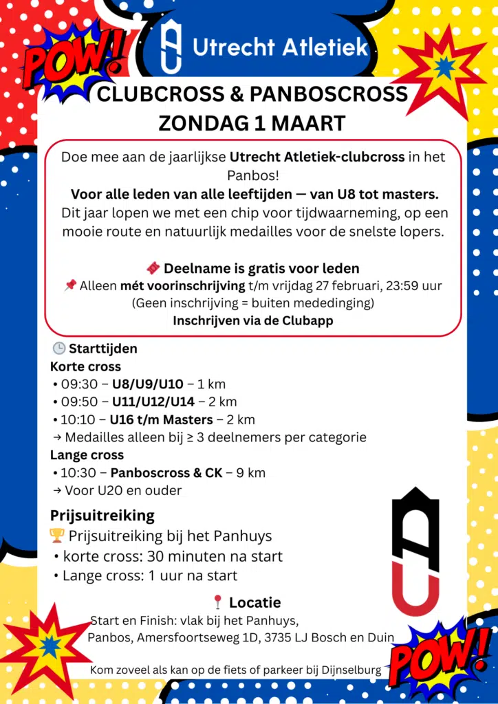 Doe mee aan de jaarlijkse clubcross van Utrecht Atletiek in het Panbos! Voor alle leeftijden — van U8 tot masters — hebben we een mooi routes, loepen we met een chip, een sportieve sfeer en natuurlijk medailles voor de snelste lopers. 🎟 Deelname is gratis voor leden 📌 Wel alleen mét voorinschrijving via de clubbapp dit kan t/m vrijdag 27 februari, 23:59 uur (Geen inschrijving = buiten mededinging) Info over de clubapp: De ClubApp | Utrecht Atletiek