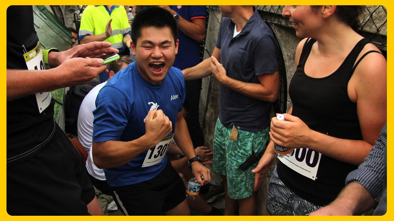 Alex Chan van U-Track was naast Rodenburg een van de andere zestig deelnemers. Hij stond met 2:23 minuut lange tijd bovenaan. "Het was superzwaar. Ik merkte dat ik halverwege al kapot was. Ik kwam echt kruipend over de finish", zegt Chan. "Ik zit op een atletiekvereniging en loop de 800 meter en de 1500 meter. Maar nooit eerder deed ik aan traplopen."