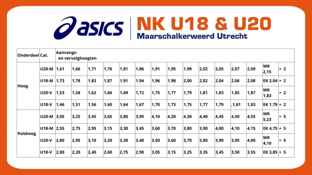 Bijgaand vind je alle informatie over het NK U18 en U20 op 14, 15 en 16 juni 2024 op Atletiekbaan Maarschalkerweerd in Utrecht.