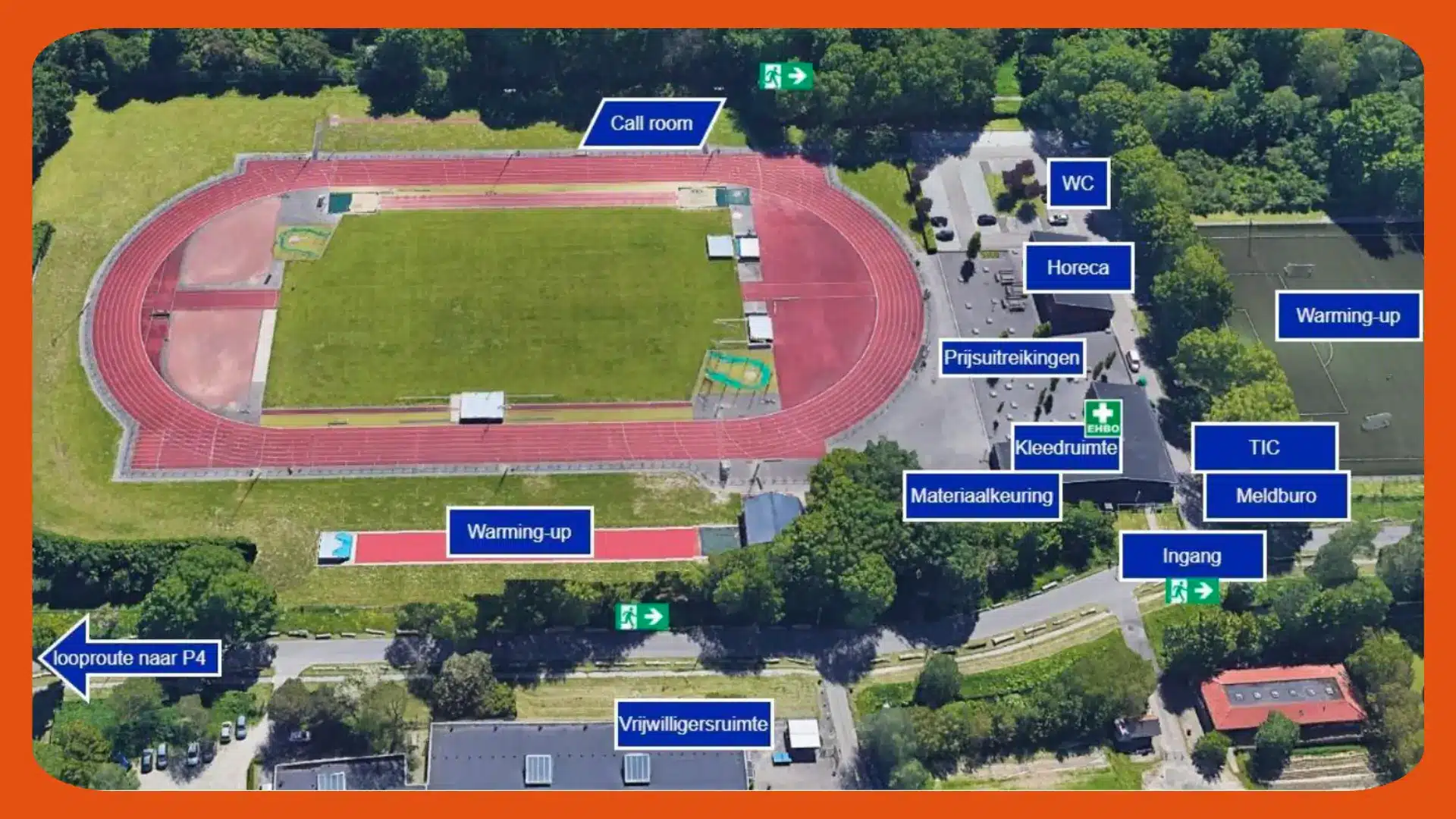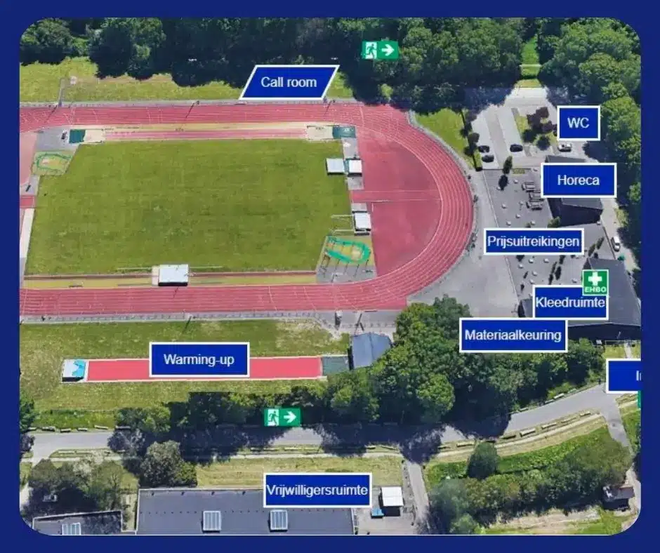 - De accommodatie biedt twee locaties voor de warming-up: het hockeyveld direct naast de ingang (geen spikes toegestaan) en de sprintlanen naast de U-Steck (enkel als daar geen polsstokhoogspringen plaatsvindt).