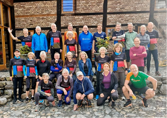 Een weekend lang op training in Hoeve Versnelberg, een rijksmonument in de buurt van Epen en de enige driehoekhoeve in Nederland. Het begon op vrijdag met een avondwandeling – in het donker – langs de Geul. Tja, en dan sta je zo ineens oog in oog met koeien die je stomverbaasd aanstaren.Als voorbereiding op een trail op zaterdag deden de trainers, Jaap, Leontien en Eric de warming-up. Nou ja, warming up: het regende pijpenstelen. Bij Leontien konden we gelukkig op een droog matje onze Pilatus doen.