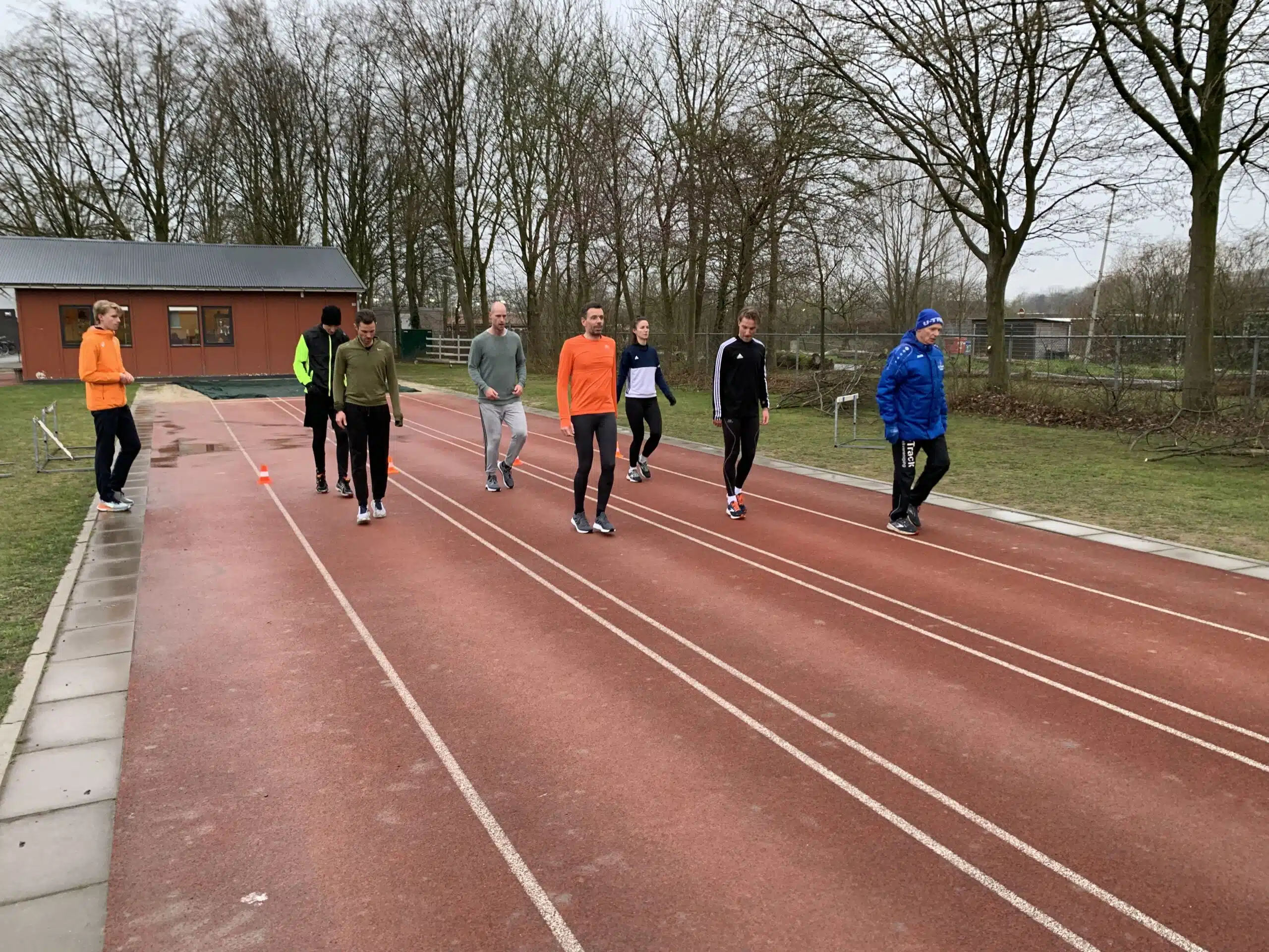 Na een kennismaking nam Jaap ons mee om 2 ronden om de baan in te lopen, gevolgd door een warming up.