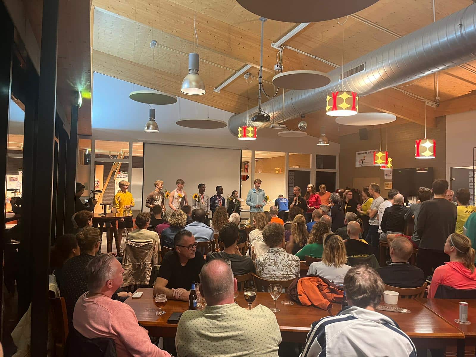 Een gemêleerd gezelschap van een D-junior tot een master 75+ en verschillende onderdelen als aquathlon tot kogelslingeren tot wheelers en van 100m sprinters tot een 100km ultraloper! Tijdens de uitreiking werden er vragen gesteld aan de atleten en hadden de atleten soms ook vragen aan elkaar. De belangrijkste gemene deler die meerdere malen naar boven kwam: het plezier in de sport en vooral het samen met elkaar sporten!